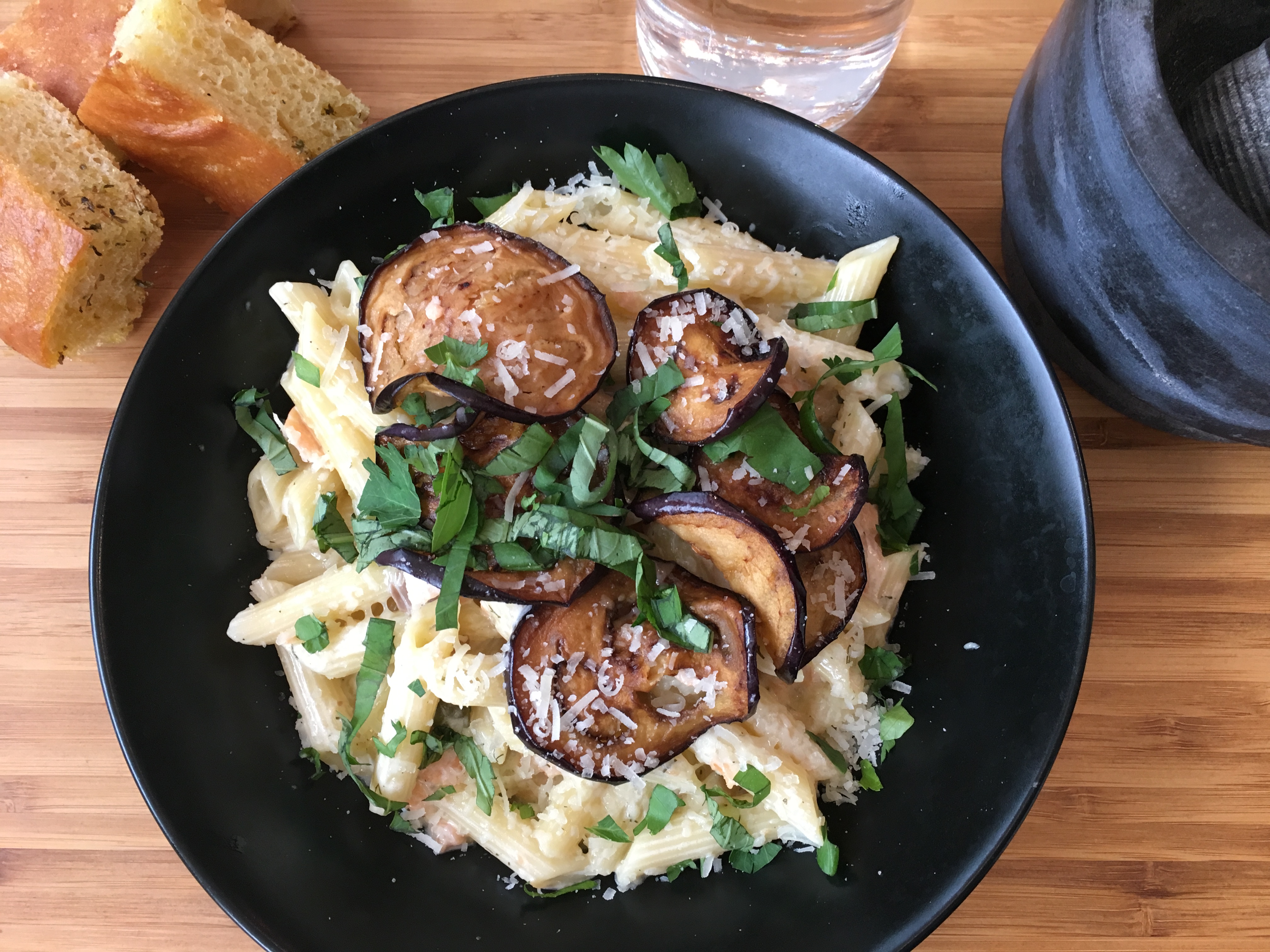 Pâtes fraîches aux aubergines fondantes et saumon, parsemées de parmesan et basilic frais.
